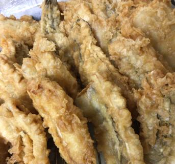 ⑤長芋の肉巻き天ぷら ⑥海老とブロッコリーのサラダ