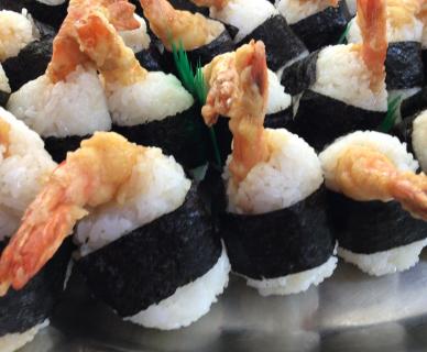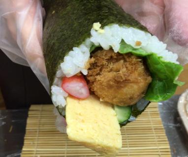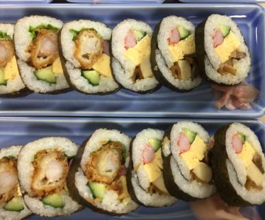 田舎巻きとエビフライ入りのサラダ巻きの2種類の巻きずしをご用意しました。