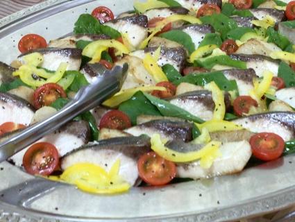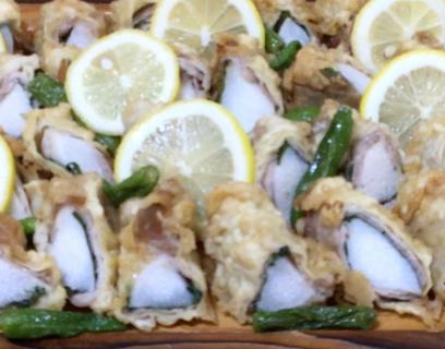 ⑤長芋の肉巻き天ぷら ⑥海老とブロッコリーのサラダ