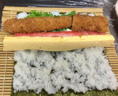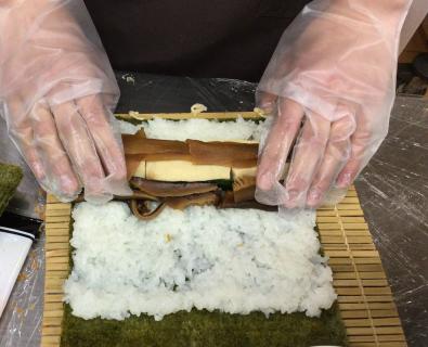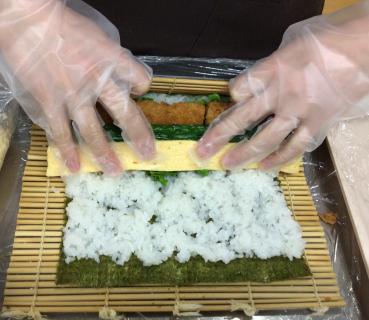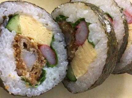 田舎巻きとエビフライ入りのサラダ巻きの2種類の巻きずしをご用意しました。