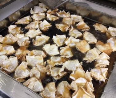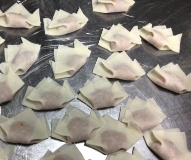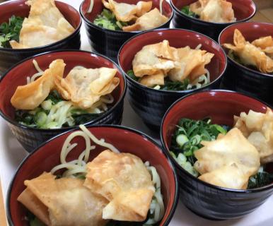 ワンタン麺はワンタンから手作りしました。揚げワンタンにして、ゆっくり食べて頂いてもふやけてしまわないように工夫しました。