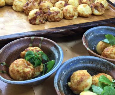 ①海老天むす ②明石焼き